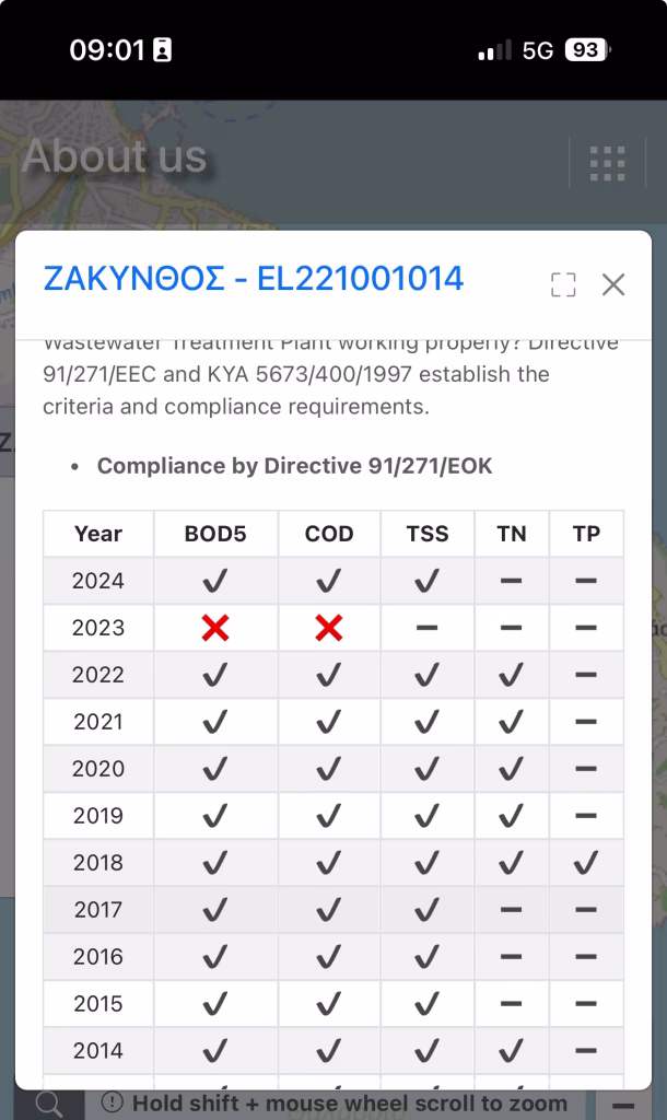 Σύμφωνα με τα πρόσφατα στοιχεία του Υπουργείου Περιβάλλοντος, ο Βιολογικός Καθαρισμός της Ζακύνθου φαίνεται να έχει επανέλθει σε συμμόρφωση με τις προδιαγραφές της Οδηγίας 91/271/ΕΟΚ για το 2024.